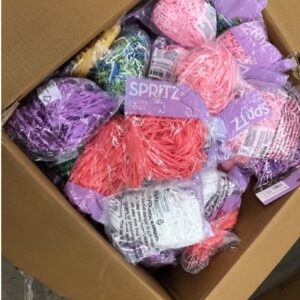 - Fillers & Grass: Bulk bags of Spritz Easter grass in pink, purple, white, and green.
